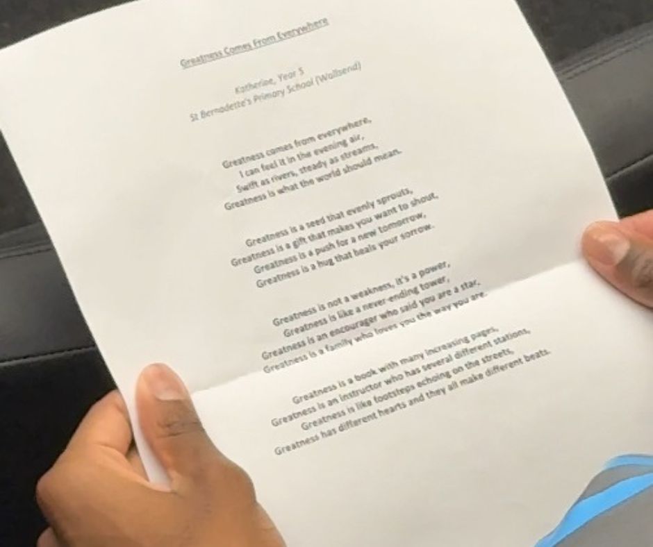The winning entry is Year 5 pupil Katherine from St Bernadette’s Primary School in Wallsend. Katherine’s poem also progresses to the national round of the competition, having already been backed by Newcastle United’s Anthony Elanga who showed admiration for the inspiring piece.